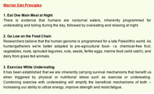 The Warrior Diet calls for ‘grazing’ or under-eating throughout the 20 hour fast, and a 4 hour window where you consume the majority of your daily calories in one or two meals. The period of under eating allows for a few SMALL meals containing ONLY lean protein and raw vegetables and sometimes fruit – the onus being on keeping blood sugar as stable as possible.